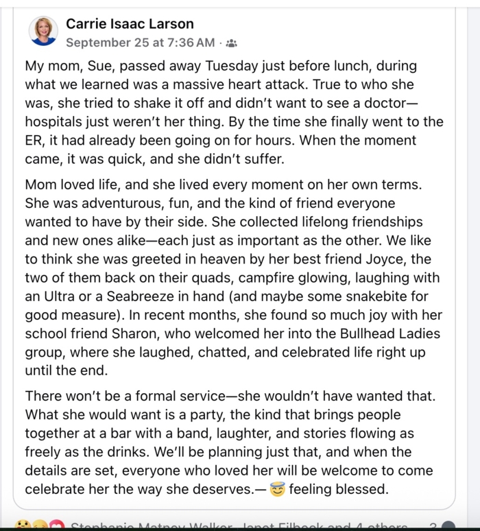 May she rest in heavenly peace. My sincere condolances to her family and friends. It sounds like Susan had a life to be celebrated!